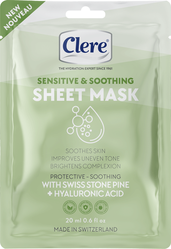 Find tranquillity for your skin with our Clere Sensitive Skin Sheet Mask, featuring Swiss Stone Pine and Hyaluronic Acid. This mask gently calms and hydrates, reducing sensitivity and leaving your skin feeling smooth, supple, and serene.
